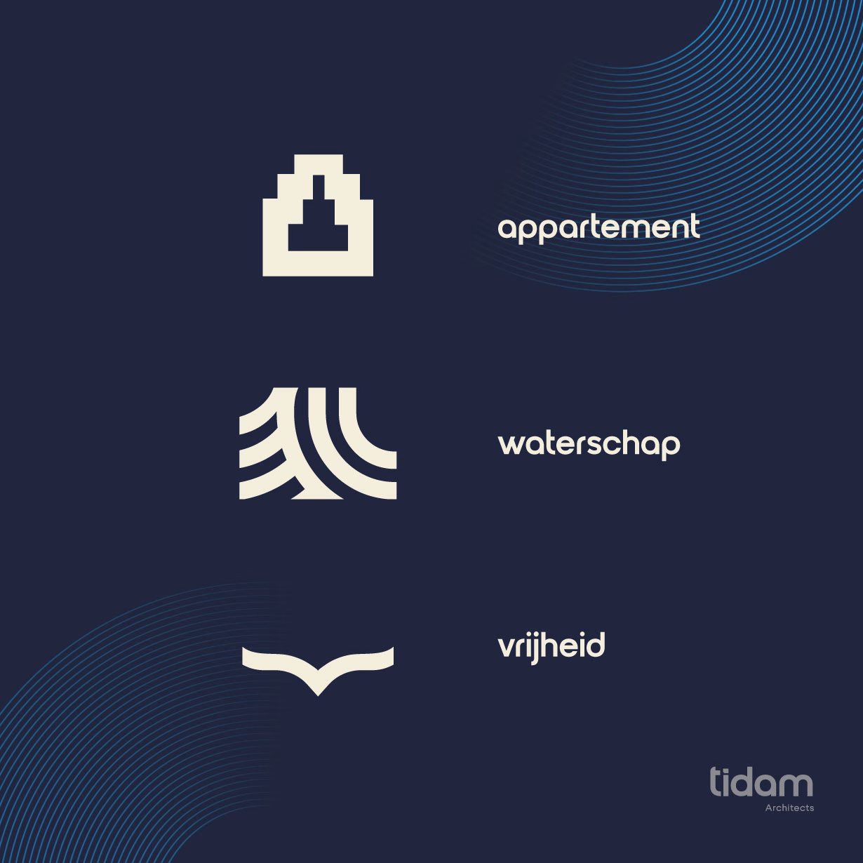 TIDAM is een architectenbureau met een sterk hart voor natuur en waterschap. Hun projecten bewegen zich op het snijvlak van stedelijke dynamiek en natuurlijke rust. Onze uitdaging was om een visuele identiteit te ontwikkelen die beide werelden samenbrengt in één krachtig beeldmerk en een bijpassende huisstijl.